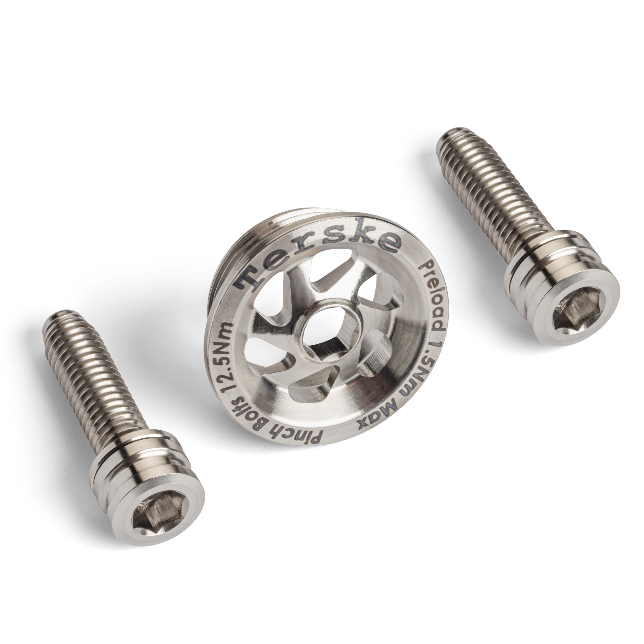 Terske's Titanium Crank Upgrade Kit replaces that tacky plastic cap and heavy steel pinch bolts with precision-machined Grade 5 Titanium. It’s a functional upgrade that brings a touch color and refinement while eliminating the need for proprietary tools.